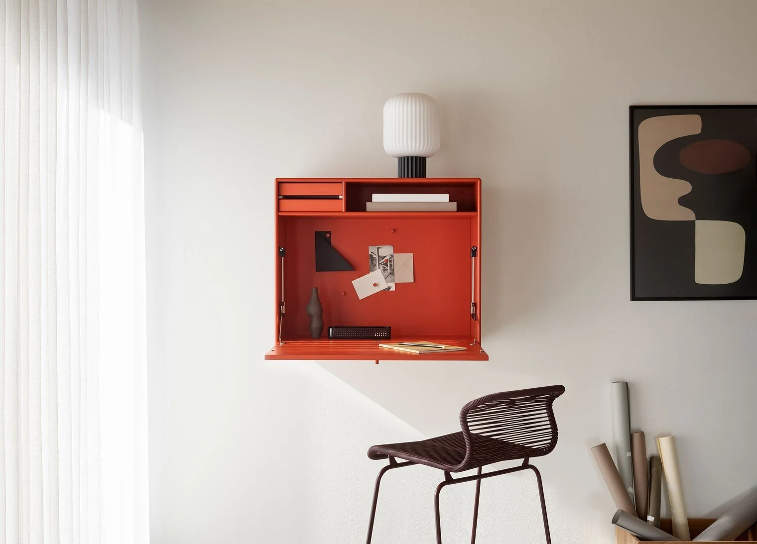 STUDIO is a neat secretary – a small desk nook that discretely hides away your home office after hours. STUDIO is equipped with a magnetic noticeboard that comes with five magnets lacquered in the same colour as the module. At the top, the secretary has a shelf and two small trays for your office supplies that you can easily take out when necessary. STUDIO is a compact and versatile work station – ideal for the multifunctional room.